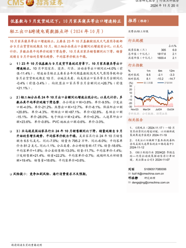 【海通证券】【20241120】轻工出口&跨境电商数据点评(2024年10月):低基数与9月发货延迟下,10月家具寝具等出口增速转正-11页 行业研究
