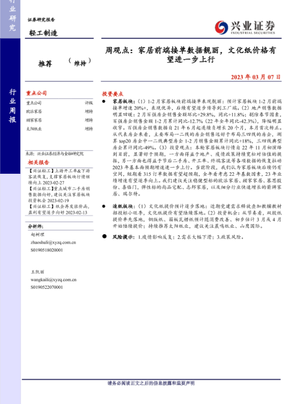 【兴业证券】【20230307】20230307-兴业证券-轻工制造周观点:家居前端接单数据靓丽,文化纸价格有望进一步上行-21页 行业研究