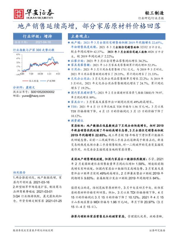 【华安证券】【20210416】轻工制造行业月报:地产销售延续高增,部分家居原材料价格回落-23页 行业研究