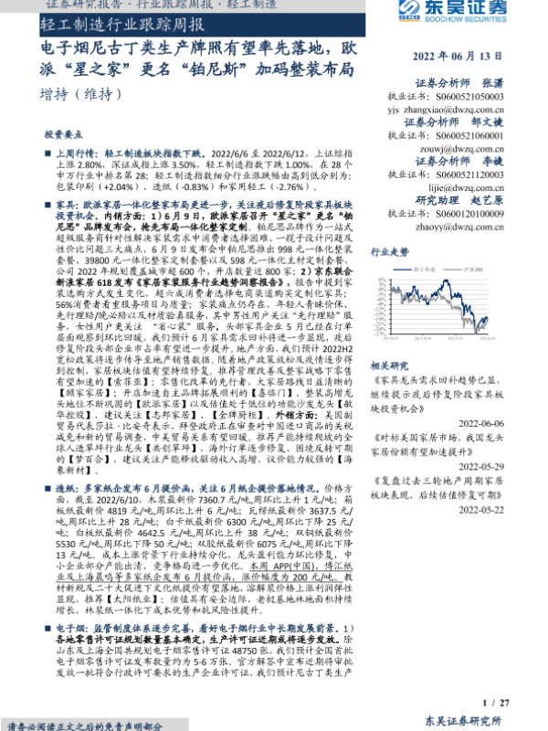 【东吴证券】【20220613】20220613-东吴证券-轻工制造行业跟踪周报:电子烟尼古丁类生产牌照有望率先落地,欧派“星之家”更名“铂尼斯”加码整装布局-27页 行业研究