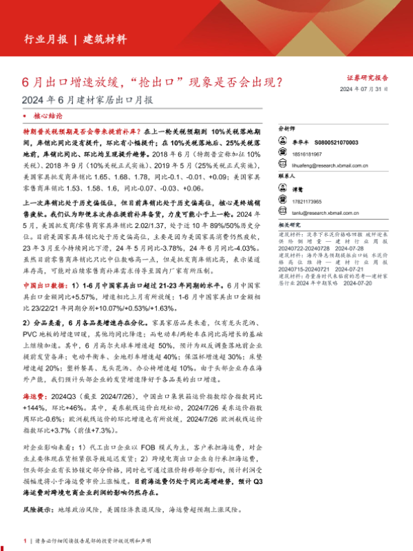 【西部证券】【20240731】建筑材料行业2024年6月建材家居出口月报:6月出口增速放缓,“抢出口”现象是否会出现?-34页 行业研究