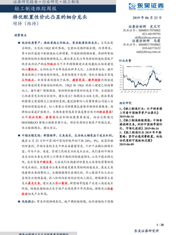 【东吴证券】【20190623】轻工制造跟踪周报:择优配置性价比凸显的细分龙头-28页 行业研究