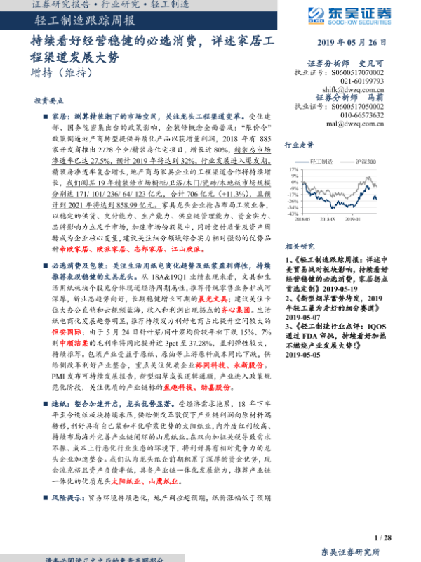 【东吴证券】【20190526】20190526-东吴证券-轻工制造跟踪周报:持续看好经营稳健的必选消费,详述家居工程渠道发展大势-28页 行业研究