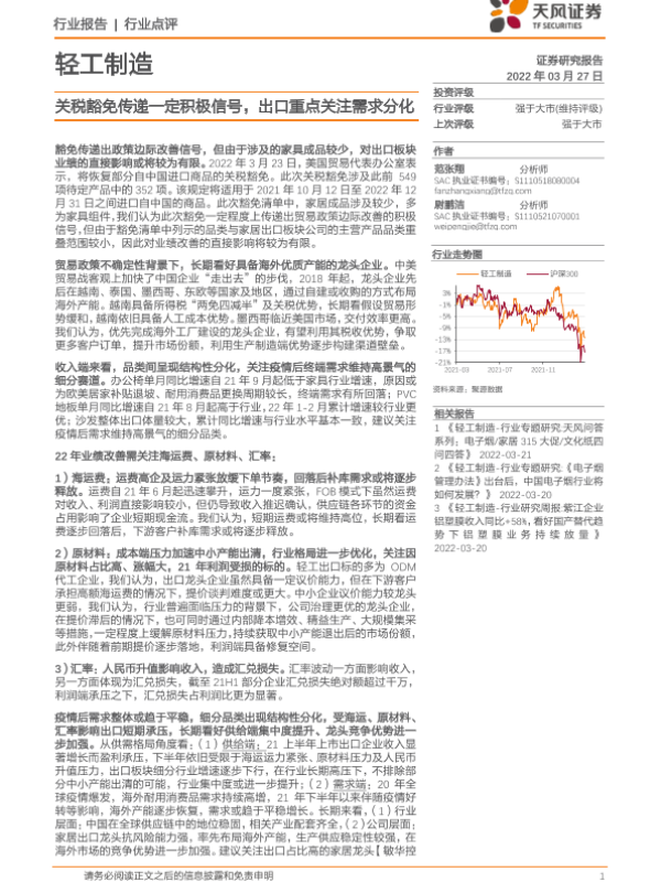 【天风证券】【20220327】轻工制造:关税豁免传递一定积极信号,出口重点关注需求分化-9页 行业研究
