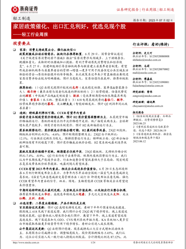 【浙商证券】【20230702】轻工行业周报:家居政策催化、出口汇兑利好,优选兑现个股-24页 行业研究