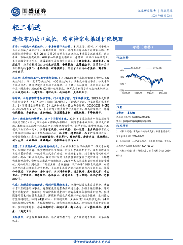 【国盛证券】【20240602】轻工制造行业周报:逢低布局出口成长,瑞尔特家电渠道扩张靓丽-37页 行业研究