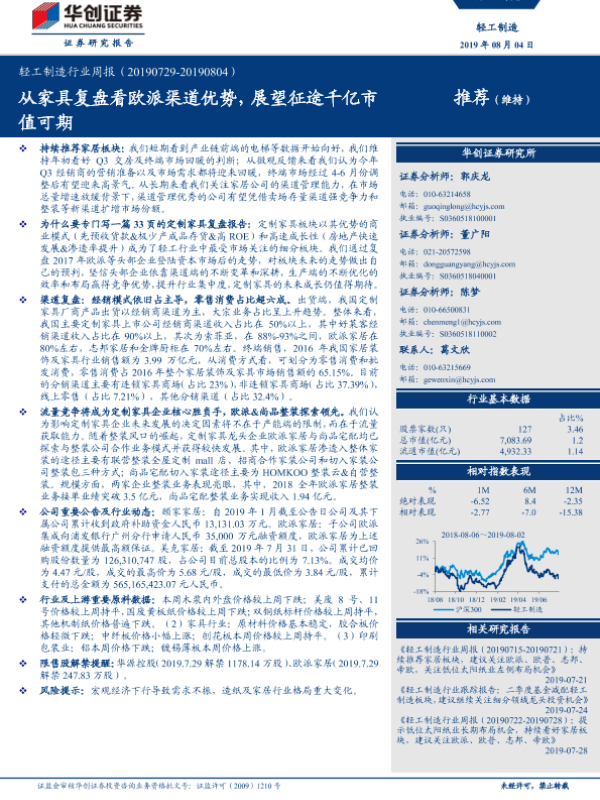 【华创证券】【20190804】轻工制造行业周报:从家具复盘看欧派渠道优势,展望征途千亿市值可期-14页 行业研究