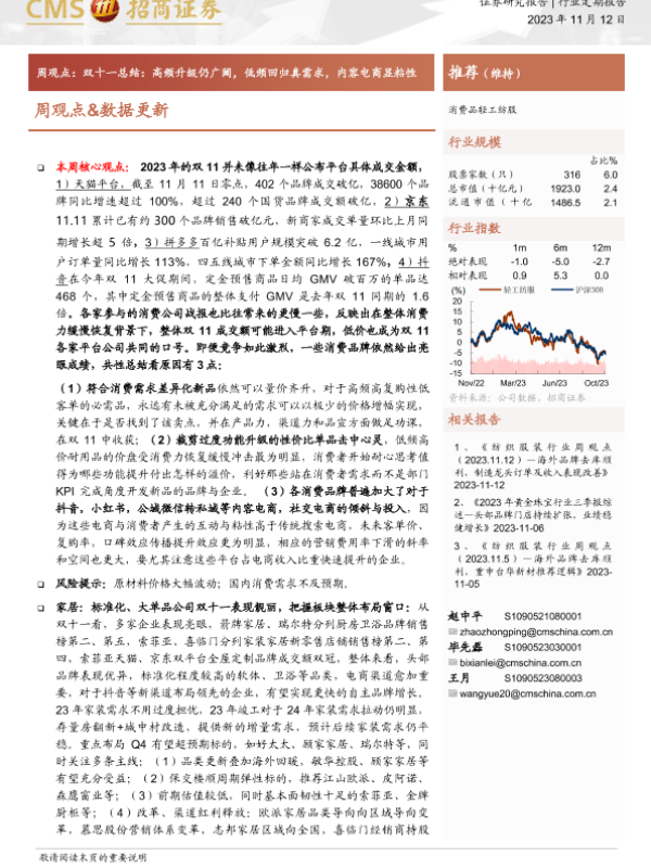 【海通证券】【20231112】20231112-招商证券-消费品轻工纺服周观点&数据更新:周观点:双十一总结:高频升级仍广阔,低频回归真需求,内容电商显粘性-32页 行业研究