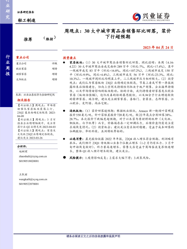 【兴业证券】【20230424】20230424-兴业证券-轻工制造行业周报:周观点:30大中城市商品房销售环比回落,浆价下行超预期-21页 行业研究