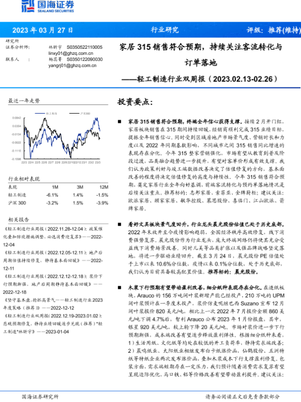 【国海证券】【20230327】轻工制造行业双周报:家居315销售符合预期,持续关注客流转化与订单落地-27页 行业研究