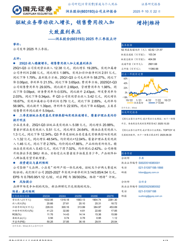【国元证券】【202510】驱蚊业务带动收入增长,销售费用投入加大致盈利承压——润本股份(603193) 2025年三季报点评-3页 证券期货研究报告
