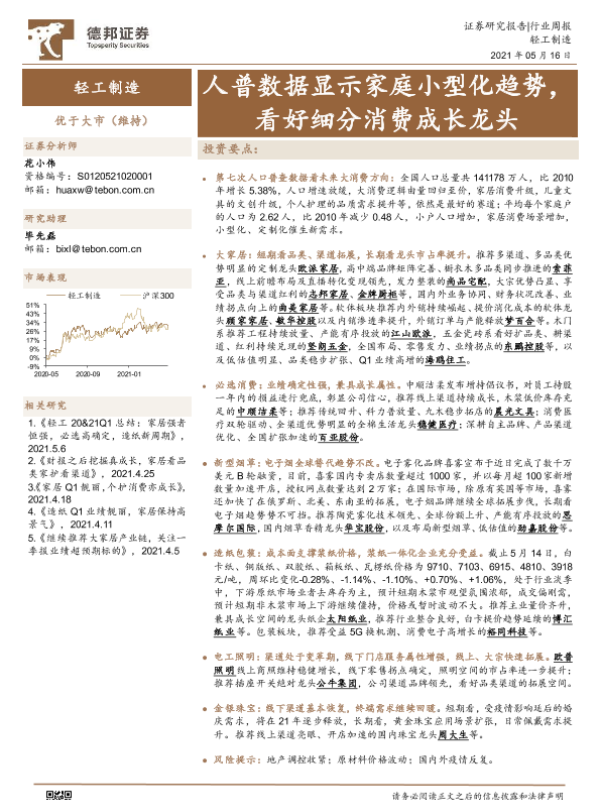 【德邦证券】【20210516】20210516-德邦证券-轻工制造行业周报:人普数据显示家庭小型化趋势,看好细分消费成长龙头-17页 行业研究