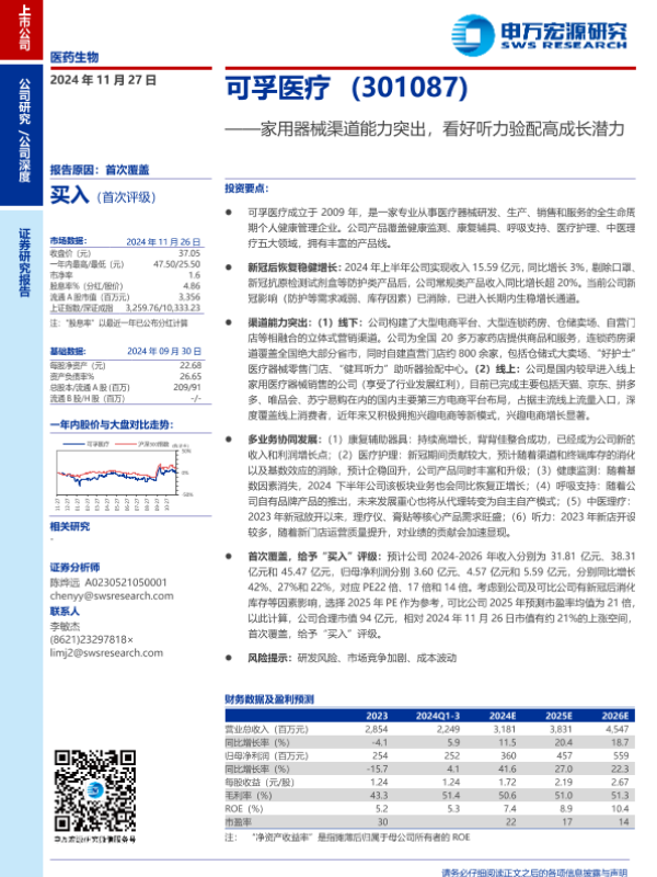 【申万宏源】【20241127】可孚医疗(301087)家用器械渠道能力突出,看好听力验配高成长潜力-25页 行业研究