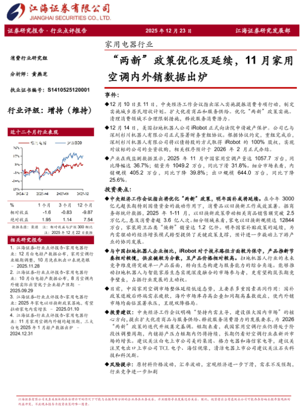 【江海证券】【202512】家用电器行业_两新_政策优化及延续_11月家用空调内外销数据出炉-3页 证券期货研究报告