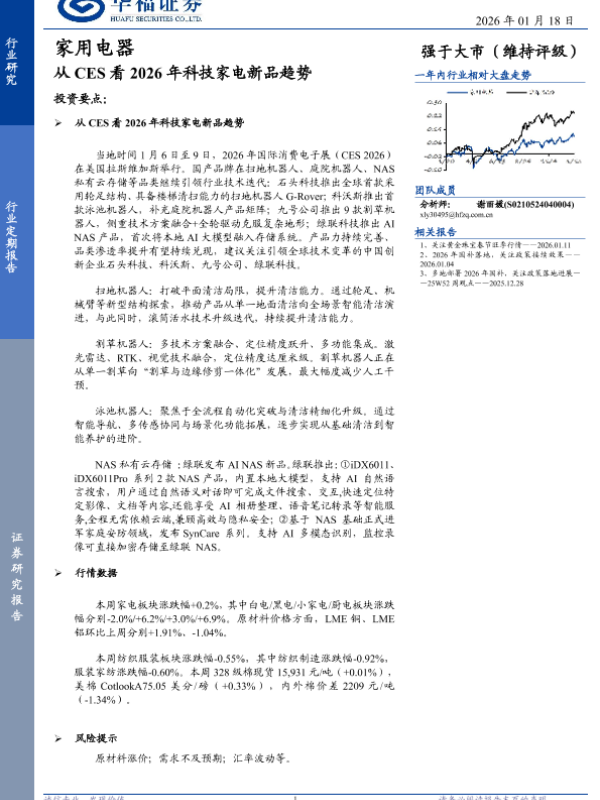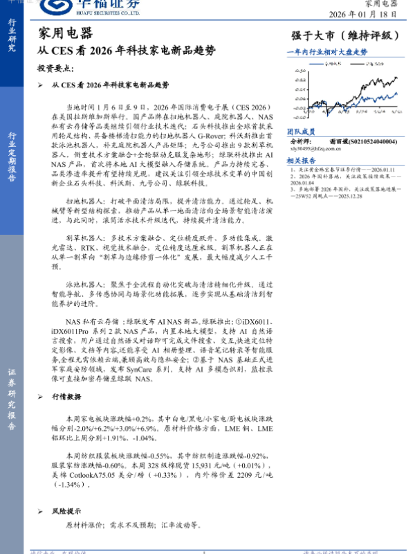 【华福证券】【202601】家用电器行业定期报告:从CES看2026年科技家电新品趋势-18页 证券期货研究报告