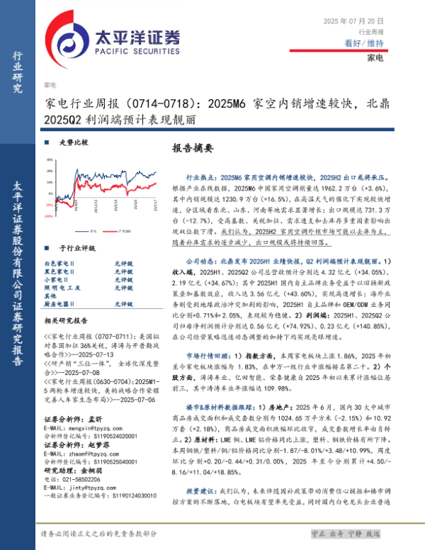 【太平洋证券】【20250720】家电行业周报:2025M6家空内销增速较快,北鼎2025Q2利润端预计表现靓丽-15页 行业研究