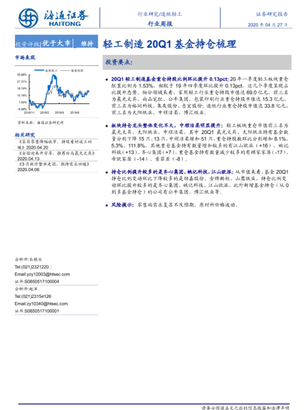 【海通证券】【20200427】20200427-海通证券-造纸轻工行业周报:轻工制造20Q1基金持仓梳理-7页 行业研究