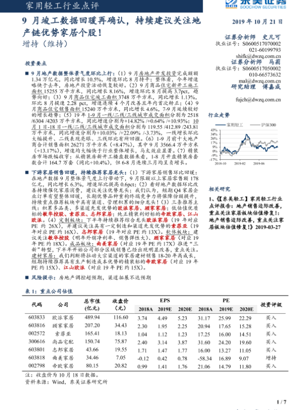 【东吴证券】【20191021】家用轻工行业点评:9月竣工数据回暖再确认,持续建议关注地产链优势家居个股!-7页 行业研究