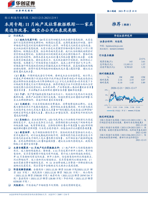 【华创证券】【20211219】20211219-华创证券-轻工制造行业周报:本周专题:11月地产及社零数据跟踪——家具类边际改善,珠宝办公用品表现亮眼-22页 行业研究