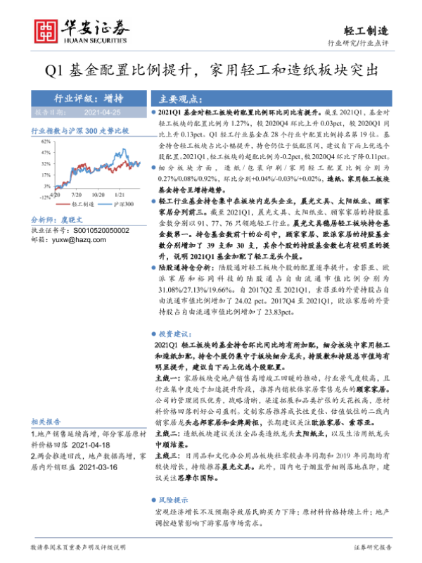 【华安证券】【20210425】Q1基金配置比例提升,家用轻工和造纸板块突出-7页 行业研究