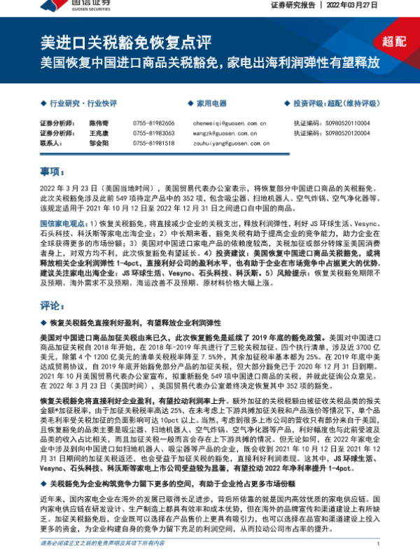 【国信证券】【20220327】美进口关税豁免恢复点评:美国恢复中国进口商品关税豁免,家电出海利润弹性有望释放-5页 行业研究