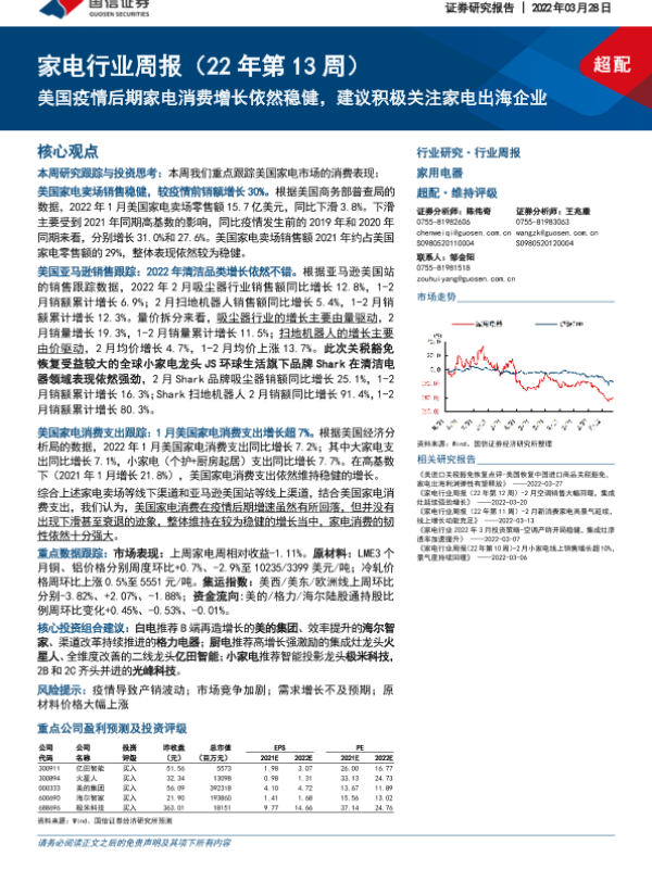 【国信证券】【20220328】家电行业周报(22年第13周):美国疫情后期家电消费增长依然稳健,建议积极关注家电出海企业-13页 行业研究