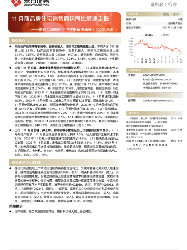 【东方证券】【20231230】20231230-东方证券-造纸轻工行业地产后周期产业链数据每周速递:11月商品房住宅销售面积同比增速走低-15页 行业研究
