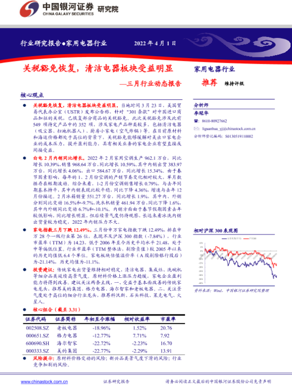 【银河证券】【20220401】家用电器行业三月行业动态报告:关税豁免恢复,清洁电器板块受益明显-26页 行业研究