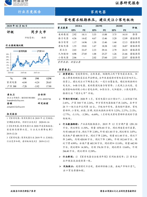 【财信证券】【20200206】家用电器行业月度报告:家电需求短期承压,建议关注小家电板块-11页 行业研究