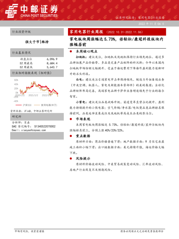 【中邮证券】【20221106】家用电器行业周报:家电板块周涨幅达5.73%,倍轻松 康冠科技板块内涨幅居前-12页 行业研究