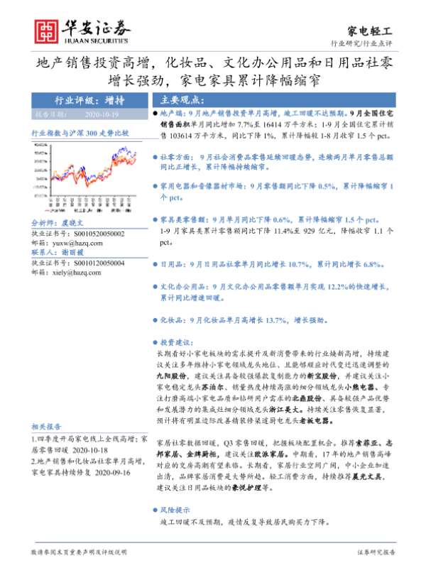 【华安证券】【20201019】20201019-华安证券-家电轻工行业点评:地产销售投资高增,化妆品、文化办公用品和日用品社零增长强劲,家电家具累计降幅缩窄-12页 行业研究