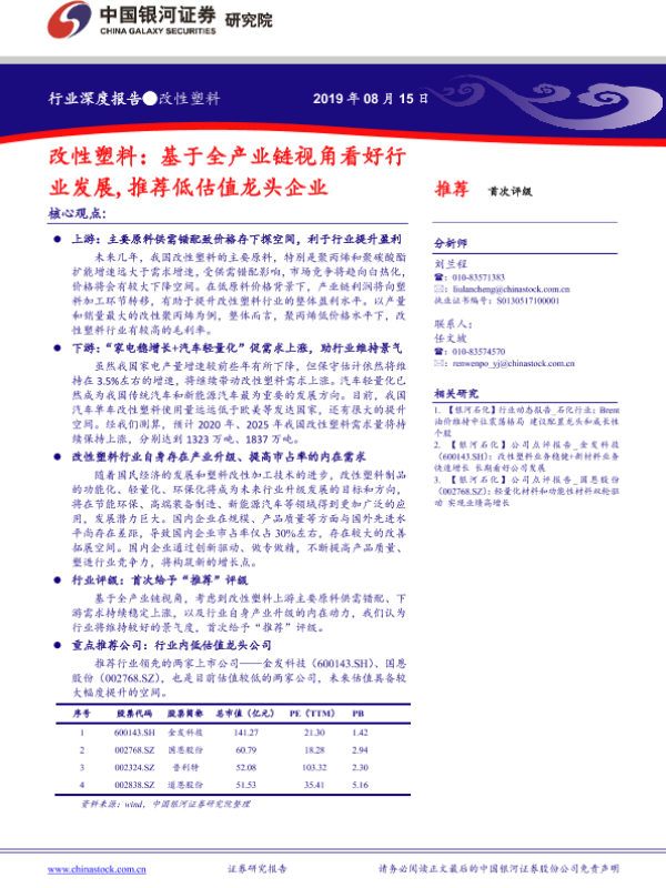 【银河证券】【20190815】改性塑料:基于全产业链视角看好行业发展,推荐低估值龙头企业-20页 行业研究
