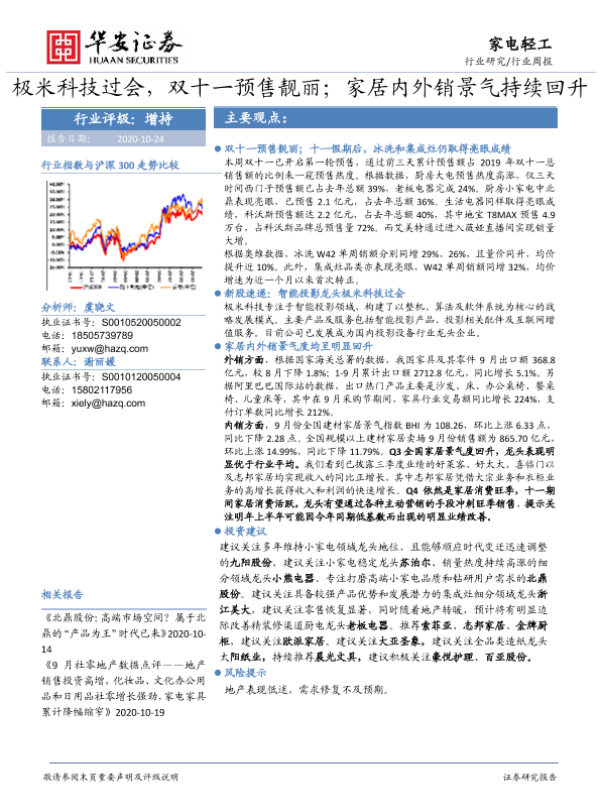 【华安证券】【20201024】20201024-华安证券-家电轻工行业周报:极米科技过会,双十一预售靓丽;家居内外销景气持续回升-20页 行业研究