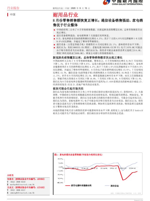 【银河证券】【20200915】8月份零售销售额恢复正增长;通信设备销售强劲,家电销售优于行业整体-3页 行业研究