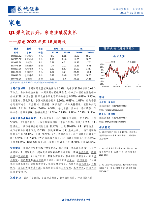 【长城证券】【20230508】家电2023年第18周周报:Q1景气度回升,家电业绩弱复苏-28页 行业研究