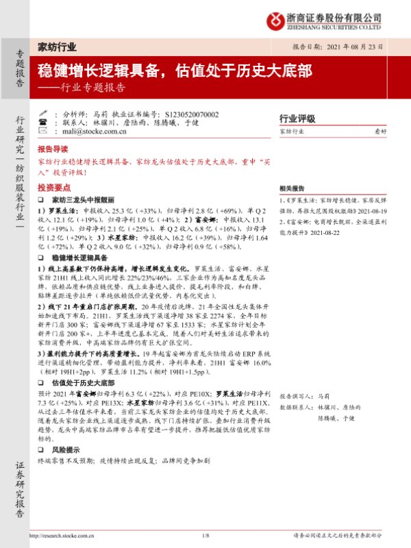 【浙商证券】【20210823】家纺行业专题报告:稳健增长逻辑具备,估值处于历史大底部-8页 行业研究