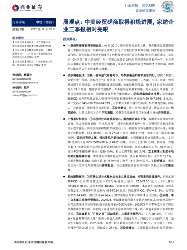 【兴业证券】【202511】纺织服饰行业周观点:中美经贸磋商取得积极进展,家纺企业三季报相对亮眼-10页 证券期货研究报告