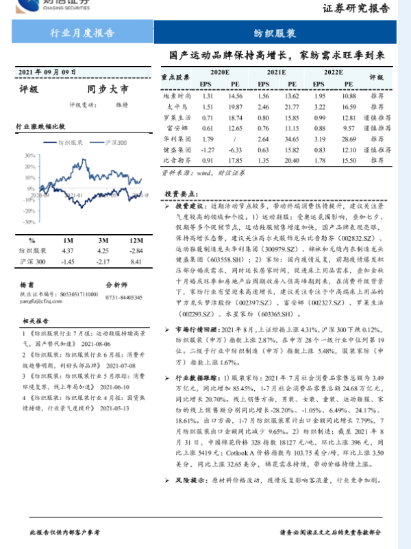 【财信证券】【20210909】纺织服装行业月度报告:国产运动品牌保持高增长,家纺需求旺季到来-17页 行业研究
