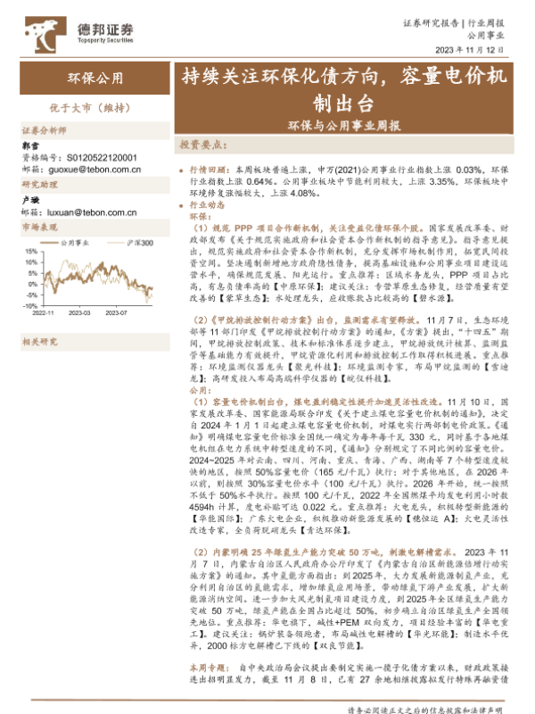 【德邦证券】【20231112】环保与公用事业周报:持续关注环保化债方向,容量电价机制出台-21页 行业研究