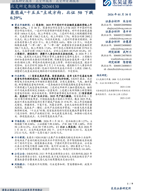 【东吴证券】【202601】氢能成“十五五”主攻方向,北证 50下跌-9页 证券期货研究报告