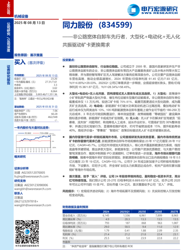 【申万宏源】【202508】同力股份(834599)——非公路宽体自卸车先行者,大型化+电动化+无人化共振驱动矿卡更换需求-29页 公司研究