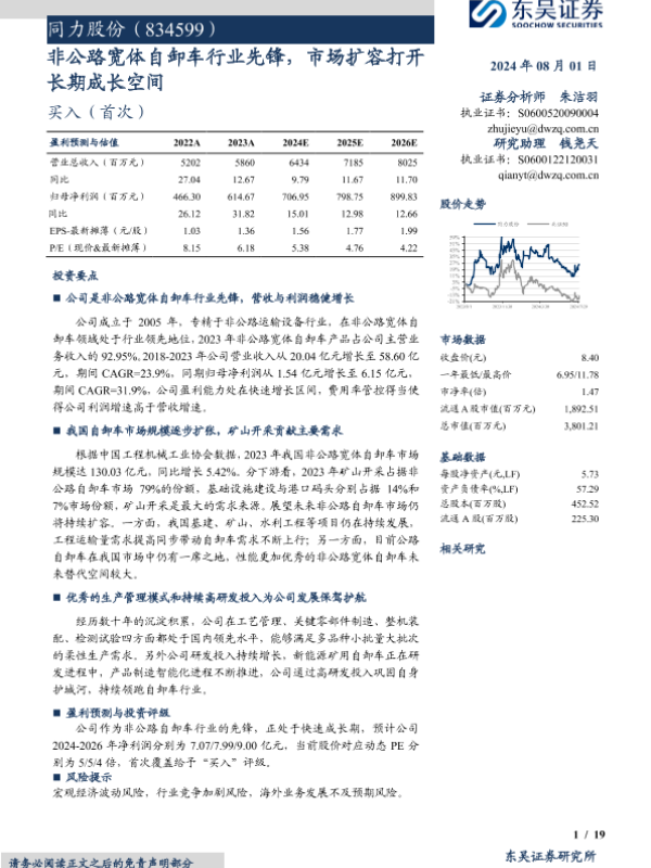 【东吴证券】【20240801】同力股份(834599)非公路宽体自卸车行业先锋,市场扩容打开长期成长空间-19页 行业研究