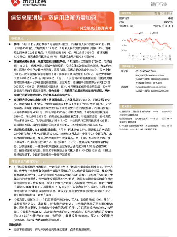 【东方证券】【20220814】7月金融统计数据点评:信贷总量滑坡,宽信用政策仍需加码-4页 行业研究