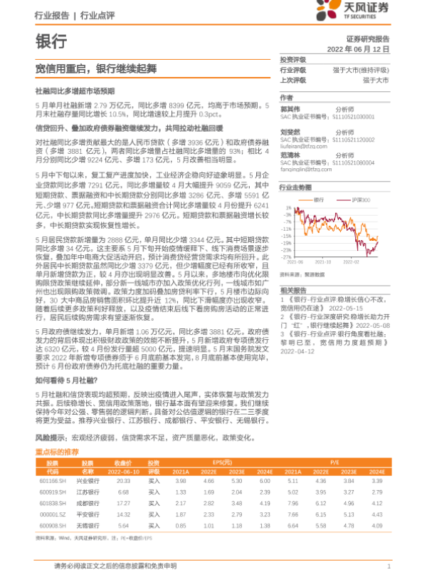 【天风证券】【20220612】宽信用重启,银行继续起舞-10页 行业研究