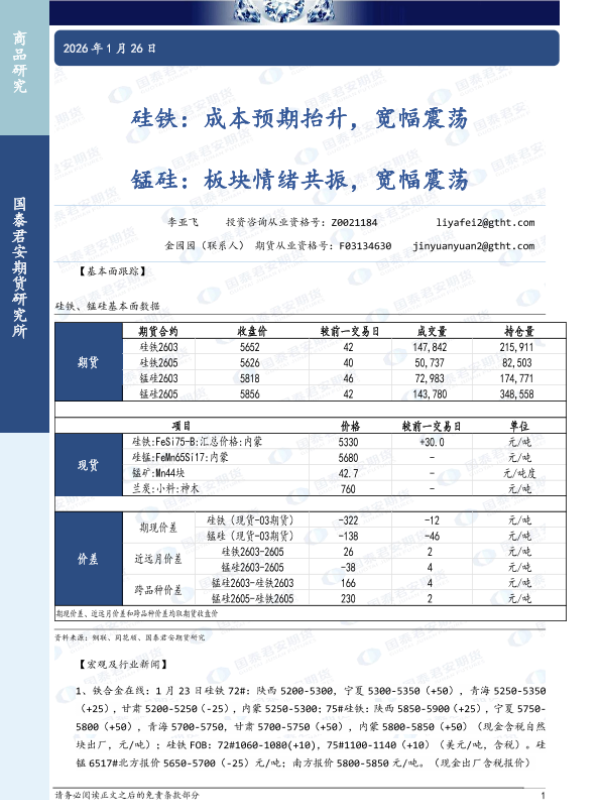 【国泰君安期货】【202601】硅铁:成本预期抬升,宽幅震荡 目泰君安期锰硅:·板块情绪共振,宽幅震荡-3页 证券期货研究报告