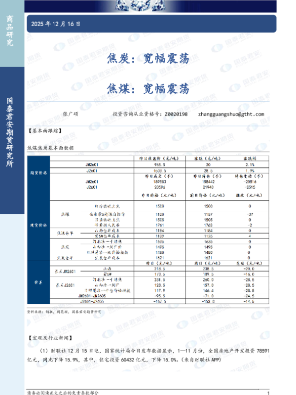 【国泰君安期货】【202512】焦炭:宽幅震荡,焦煤:宽幅震荡-3页 证券期货研究报告
