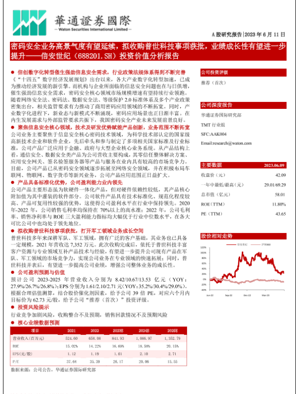 【华通证券国际】【20230611】信安世纪-688201.SH-投资价值分析报告:密码安全业务高景气度有望延续,拟收购普世科技事项获批,业绩成长性有望进一步提升-30页 行业研究