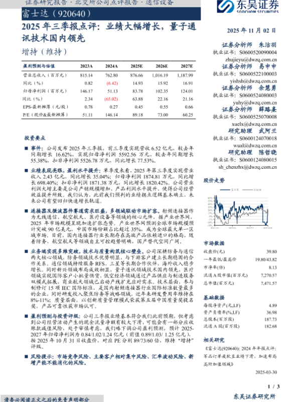 【东吴证券】【202511】2025年三季报点评:业绩大幅增长,量子通讯技术国内领先-3页 证券期货研究报告