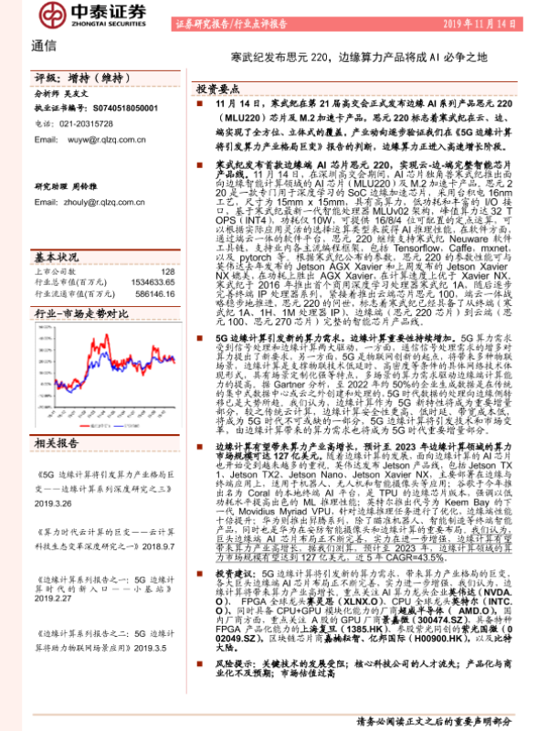 【中泰证券】【20191114】寒武纪发布思元220,边缘算力产品将成AI必争之地-2页 行业研究