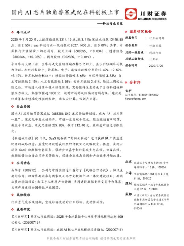【川财证券】【20200720】科技行业日报:国内AI芯片独角兽寒武纪在科创板上市-3页 证券期货研究报告
